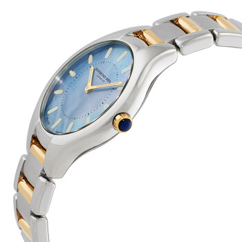 Silver-tone stainless steel case with a two-tone (silver-tone and yellow gold-tone) stainless steel bracelet. Fixed stainless steel bezel. Blue mother of pearl dial with gold-tone hands and index hour markers. Dial Type: Analog. Quartz movement. Scratch resistant sapphire crystal. Pull / push crown. Solid case back. Round case shape, case size: 32 mm, case thickness: 7.58 mm. Fold over clasp with a safety release. Water resistant at 50 meters / 165 feet. Functions: hour, minute. Noemia Series. Dress watch style. Watch label: Swiss Made. Raymond Weil Noemia Quartz Blue Mother of Pearl Dial Ladies Watch 5132-STP-97501.