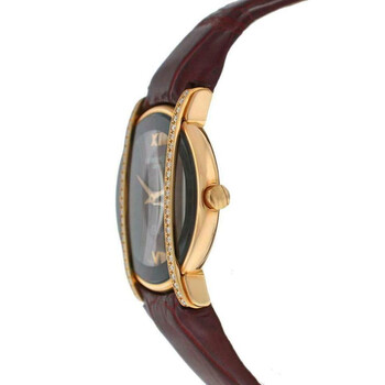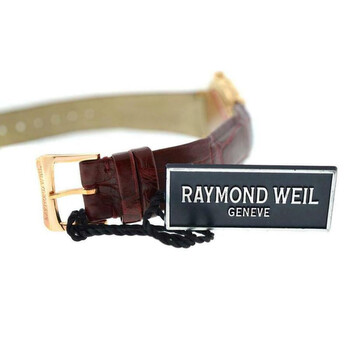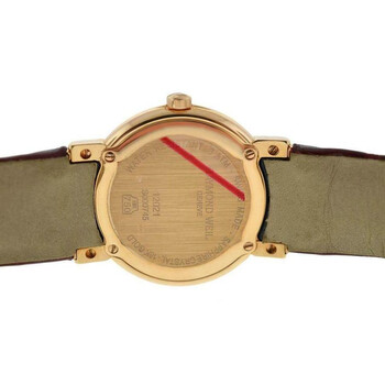 Yellow gold-tone 18kt yellow gold case with a brown leather strap. Fixed yellow gold-tone bezel with diamond set 18kt yellow gold. Brown dial with yellow gold-tone hands and Roman numeral hour markers. Dial Type: Analog. Quartz movement. Scratch resistant sapphire crystal. Solid case back. Round case shape, case size: 28 mm. Buckle clasp. Water resistant at 30 meters / 100 feet. Functions: hour, minute. Othello Series. Dress watch style. Watch label: Swiss Made. Raymond Weil Othello Quartz Diamond Brown Dial Ladies Watch 12021-GS-00480.