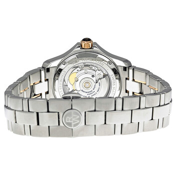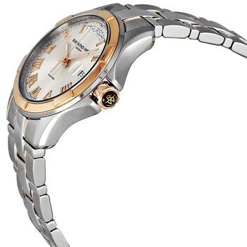 Stainless steel case with a two-tone (silver-tone and 18kt gold PVD) stainless steel bracelet. Fixed 18kt gold PVD bezel. Silver dial with rose gold-tone hands and Roman numeral hour markers. Minute markers around the outer rim. Dial Type: Analog. Luminescent hands and markers. Date display at the 3 o'clock position. Day of the week display appears at the 12 o'clock position. Automatic movement with a 38-hour power reserve. Scratch resistant sapphire crystal. Pull / push crown. Skeleton case back. Case diameter: 39 mm. Case thickness: 10.15 mm. Round case shape. Band length: 7 inches. Deployment clasp with push button release. Water resistant at 100 meters / 330 feet. Functions: date, day, hour, minute, second. Dress watch style. Raymond Weil Parsifal Automatic Men's Watch 2965-SG5-00658.