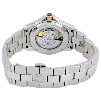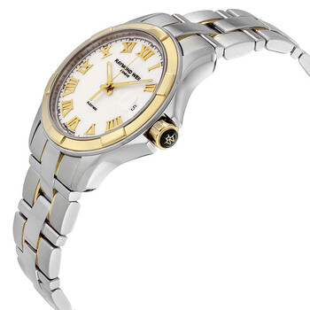 Silver-tone stainless steel case with a two-tone (silver-tone and gold-tone) stainless steel with 18kt yellow gold bracelet. Fixed 18kt yellow gold bezel. White dial with gold-tone hands and Roman numeral hour markers. Minute markers around the outer rim. Dial Type: Analog. Luminescent hands and markers. Date display at the 3 o'clock position. Automatic movement with a 38-hour power reserve. Scratch resistant sapphire crystal. Pull / push blue lacquered crown. Skeleton case back. Round case shape, case size: 39 mm, case thickness: 9.6 mm. Band width: 20 mm. Deployment with push button release clasp. Water resistant at 100 meters / 330 feet. Functions: date, hour, minute, second. Parsifal Series. Dress watch style. Watch label: Swiss Made. Item Variations: 2970 SG 00308, 2970.SG.00308, 2970SG00308. Raymond Weil Parsifal Automatic White Dial 18 kt Yellow Gold and Steel Men's Watch 2970-SG-00308.