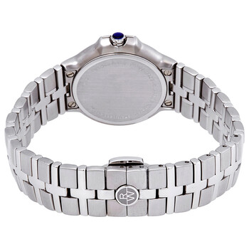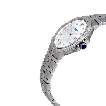 Stainless steel case with a stainless steel bracelet. Fixed stainless steel bezel. Silver mother of pearl dial with silver-tone hands and diamond hour markers. Roman numerals appear at the 6, 9 and 12 o'clock positions, Minute markers around the outer rim. Dial Type: Analog. Date display at the 3 o'clock position. Quartz movement. Scratch resistant sapphire crystal. Pull / push crown. Solid case back. Round case shape. Case size: 30 mm. Case thickness: 5.9 mm. Fold over clasp with a double safety release. Water resistant at 50 meters / 165 feet. Functions: date, hour, minute, second. Additional Info: 8 diamonds on dial / 0.03 ct. Parsifal Series. Dress watch style. Watch label: Swiss Made. Raymond Weil Parsifal Diamond Silver Mother of Peal Dial Ladies Watch 5180-ST-00995.