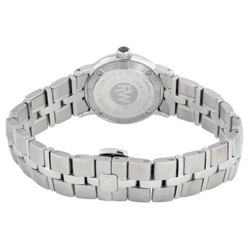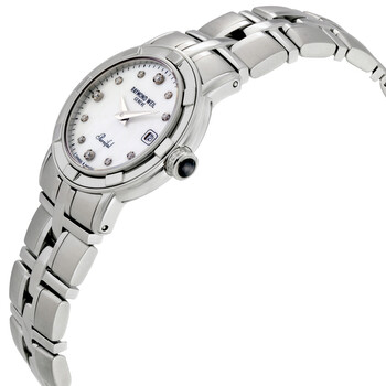 Stainless steel case with a stainless steel bracelet. Fixed stainless steel bezel. Mother of pearl dial with silver- tone hands and diamond hour markers. Minute markers around the outer rim. Date displays at the 3 o'clock position. Quartz movement. Scratch resistant sapphire crystal. Cabochon crown. Solid case back. Case diameter: 27 mm. Case thickness: 6 mm. Push button deployment clasp. Water resistant at 100 meters / 330 feet. Functions: hours/ minutes/ seconds/ date. Raymond Weil Parsifal Ladies Watch 9441-ST-97081.