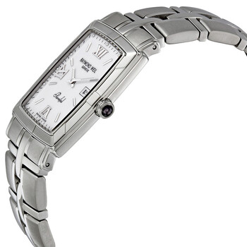Stainless steel case with a stainless steel bracelet. Fixed stainless steel bezel. White dial with silver tone hands and stick and Roman numeral hour markers. Roman numerals mark the 6, 9 and 12 o'clock positions. Minute markers around the outer rim. Date displays at the 3 o'clock position. Quartz movement. Scratch resistant sapphire crystal. Black sapphire crown. Screw down case back. Case dimensions: 28.5 mm x 34 mm. Deployment clasp. Water resistant at 100 meters / 330 feet. Functions: hours, minutes, seconds, date. Raymond Weil Parsifal Men's Watch 9341-ST-00307.