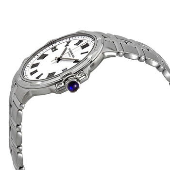 Stainless steel case with a stainless steel bracelet. Fixed stainless steel bezel. White dial with black hands and Roman numeral hour markers. Minute markers around the outer rim. Dial Type: Analog. Date display at the 3 o'clock position. Quartz movement. Scratch resistant sapphire crystal. Pull / push crown. Solid case back. Round case shape. Case size: 41 mm. Case thickness: 6.75 mm. Band width: 22 mm. Fold over clasp with double safety release. Water resistant at 50 meters / 165 feet. Functions: date, hour, minute, second. Dress watch style. Watch label: Swiss Made. Raymond Weil Parsifal White Dial Men's Watch 5580-ST-00300.