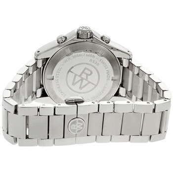 Stainless steel case with a stainless steel bracelet. Fixed ion-plated with tachymeter bezel. Black dial with luminous hands and stick hour markers. Minute markers around the outer rim. Luminescent hands and markers. Date displays at the 12 o'clock position. Chronograph - three sub-dials displaying: 60 seconds, 30 minutes and 1/10th of a second. Quartz movement. Scratch resistant sapphire crystal. Solid case back. Case diameter: 44 mm. Case thickness: 12 mm. Deployment clasp. Water resistant at 200 meters / 660 feet. Functions: hours, minutes, seconds, date, chronograph, tachymeter. Raymond Weil RW Sport Men's Watch 8520-ST-20041.