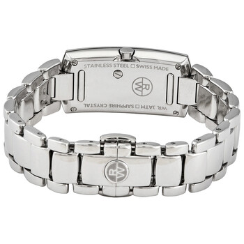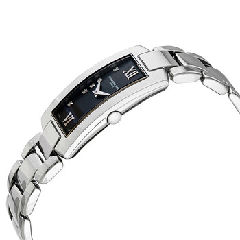 Stainless steel case with a stainless steel bracelet. Fixed stainless steel bezel. Black dial with silver-tone hands and diamond hour markers. Roman numerals mark the 6 and 12 o'clock positions. Dial Type: Analog. Quartz movement. Scratch resistant sapphire crystal. Screw down crown. Solid case back. Rectangle case shape. Case dimensions: 44.2 mm x 19 mm. Case thickness: 6 mm. Band width: 15 mm. Fold over clasp with a double push button release. Water resistant at 30 meters / 100 feet. Functions: hour, minute. Casual watch style. Watch label: Swiss Made. Item Variations: 1500 ST 00785, 1500.ST.00785, 1500ST00785. Raymond Weil Shine Diamond Black Dial Ladies Watch 1500-ST-00785.