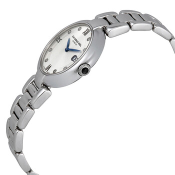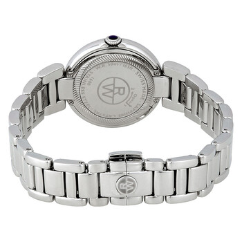 Stainless steel case with a stainless steel bracelet. Fixed stainless steel bezel. Silver dial with bue hands and diamond hour markers. Roman numerals mark the 3, 6, 9 and 12 o'clock positions. Dial Type: Analog. Date display at the 3 o'clock position. Quartz movement. Scratch resistant sapphire crystal. Pull / push crown. Solid case back. Round case shape. Case size: 32 mm. Case thickness: 8.63 mm. Fold over clasp with a push button release. Water resistant at 50 meters / 165 feet. Functions: date, hour, minute. Additional Info: two interchangeable straps crafted in repetto leather. Dress watch style. Watch label: Swiss Made. Raymond Weil Shine Etoile Diamond Silver Dial Ladies Watch 1600-ST-RE695.
