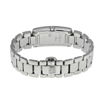 Stainless steel case with a stainless steel bracelet. Fixed silver-tone bezel set with 48 diamond (0.34cts). White mother of pearl dial with silver-tone hands. Arabic numerals mark the 3, 6, 9 and 12 o'clock positions. Dial Type: Analog. Quartz movement. Scratch resistant sapphire crystal. Solid case back. Case dimensions: 19.8 mm x 44 mm. Case thickness: 6.6 mm. Rectangle case shape. Deployment clasp with push button. Water resistant at 30 meters / 100 feet. Functions: hour, minute, second. Additional Info: interchangeable strap - comes with black fabric strap. Dress watch style. Watch label: Swiss Made. Raymond Weil Shine Ladies Watch 1500-ST1-05303.