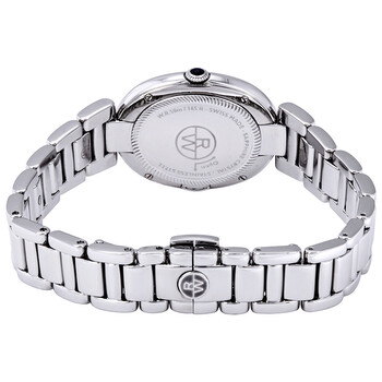 Stainless steel case with a silver-tone stainless steel bracelet. Fixed stainless steel bezel. Silver dial with blue hands and Roman numeral hour markers. Minute markers around an inner ring. Dial Type: Analog. ETA caliber F04.101 quartz movement. Scratch resistant sapphire crystal. Pull / push crown. Solid case back. Oval case shape. Case dimensions: 29 mm by 36 mm. Case thickness: 8.74 mm. Fold over clasp. Water resistant at 50 meters / 165 feet. Functions: hour, minute. Additional Info: diamonds on case (0.17 ct). includes a black satin strap. Shine Series. Luxury watch style. Watch label: Swiss Made. Raymond Weil Shine Silver Dial Diamond Ladies Watch 1700-STS-00659.