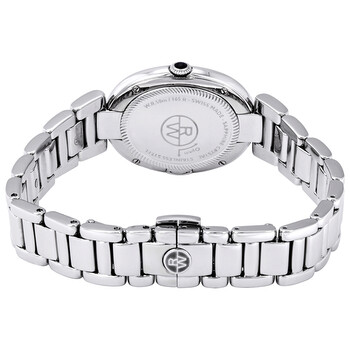 Silver-tone stainless steel case and bracelet. Silver dial with blue hands and Roman numeral hour markers. Minute markers around an inner ring. Dial Type: Analog. ETA Caliber F04.101 quartz movement. Scratch resistant sapphire crystal. Pull / push crown. Solid case back. Oval case shape, case size: 29 mm, case thickness: 8.74 mm. Band width: 15 mm. Fold over clasp. Water resistant at 50 meters / 165 feet. Functions: hour, minute. Additional Info: comes with an additional black leather strap. Shine Series. Dress watch style. Watch label: Swiss Made. Raymond Weil Shine Silver Dial Ladies Watch 1700-ST-00659.