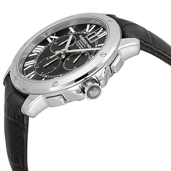 Stainless steel case with a black leather strap. Fixed stainless steel bezel. Black dial with silver-toned hands and Roman numeral hour markers. Minute markers around an inner ring. Dial Type: Analog. Luminescent hands and markers. Date display at the 12 o'clock position. Chronograph - three sub-dials displaying: 60 second, 30 minute and 1/10th of a second. Quartz movement. Scratch resistant sapphire crystal. Pull / push crown. Solid case back. Case diameter: 40 mm. Case thickness: 10 mm. Round case shape. Band width: 16 mm. Band length: 8.25 inches. Tang clasp. Water resistant at 100 meters / 330 feet. Functions: chronograph, date, hour, minute, second. Luxury watch style. Watch label: Swiss Made. Raymond Weil Tango Black Dial Chronograph Black Leather Men's Watch 4891-STC-00200.