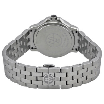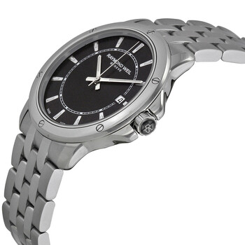 Stainless steel case with a stainless steel bracelet. Fixed stainless steel bezel. Black dial with luminous silver-tone hands and index hour markers. Minute markers around an inner ring. Dial Type: Analog. Luminescent hands and markers. Date display at the 3 o'clock position. Quartz movement. Scratch resistant sapphire crystal. Pull / push crown. Solid case back. Case diameter: 39 mm. Case thickness: 7.9 mm. Round case shape. Band width: 22.9 mm. Band length: 9 inches. Deployment clasp. Water resistant at 100 meters / 330 feet. Functions: date, hour, minute, second. Luxury watch style. Watch label: Swiss Made. Raymond Weil Tango Black Dial Stainless Steel Men's Watch 5591-ST-20001.
