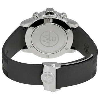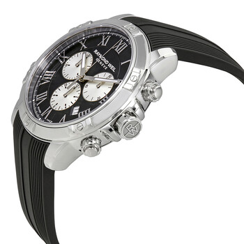 Stainless steel case with a black rubber strap. Fixed stainless steel bezel. Black dial with luminous silver-tone hands and Roman numeral hour markers. Minute markers around the outer rim. Dial Type: Analog. Luminescent hands. Date display between the 4 and 5 o'clock positions. Chronograph - three silver sub-dials displaying: 60 second, 30 minute and 12 hours. Quartz movement. Scratch resistant sapphire crystal. Screw down crown. Solid case back. Case size: 43 mm. Case thickness: 11.9 mm. Round case shape. Band width: 20 mm. Deployment clasp with a push button release. Water resistant at 300 meters / 1000 feet. Functions: chronograph, date, hour, minute, second. Dress watch style. Watch label: Swiss Made. Raymond Weil Tango Chronograph Black Dial Men's Watch 8560-SR-00206.