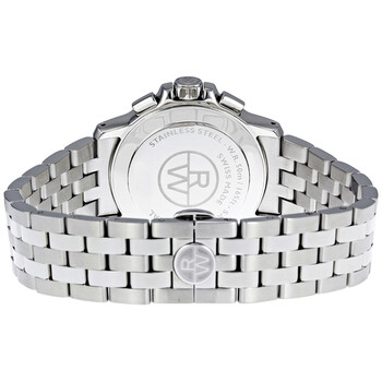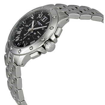 Stainless steel case with a stainless steel bracelet. Fixed stainless steel bezel. Black dial with silver-tone hands and Roman numeral hour markers. Minute markers around the outer rim. Dial Type: analog. Luminescent hands and markers. Date display at 12 the o'clock position. Chronograph - three sub-dials displaying: 60 seconds, 30 minutes and 1/10th of a second. Quartz movement. Scratch resistant sapphire crystal. Push / pull crown. Solid case back. Case diameter: 40 mm. Case thickness: 9.5 mm. Bracelet width: 20 mm. Deployment clasp. Water resistant at 50 meters / 165 feet. Casual watch style. Watch label: Swiss Made.Raymond Weil Tango Chronograph Men's Watch 4899-ST-00208.