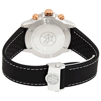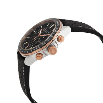 Stainless steel case with a black rubber strap. Fixed rose gold PVD bezel with anodized black ring showing tachymeter markings. Black dial with luminous rose gold-tone hands and index hour markers. Minute markers around the outer rim. Dial Type: Analog. Luminescent hands and markers. Date display between the 4 and 5 o'clock positions. Chronograph - three sub-dials displaying: 60 second, 30 minute and 12 hour. Quartz movement. Scratch resistant sapphire crystal. Screw down crown. Solid case back. Round case shape. Case size: 43 mm. Case thickness: 11.9 mm. Fold over clasp with a safety release. Water resistant at 300 meters / 1000 feet. Functions: chronograph, tachymeter, date, hour, minute, second. Tango Series. Casual watch style. Watch label: Swiss Made. Raymond Weil Tango Chronograph Quartz Black Dial Men's Watch 8570 -R51-20001.