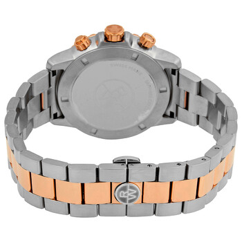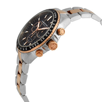 Stainless steel case with a two-tone (silver-tone and rose gold PVD) stainless steel bracelet. Fixed rose gold PVD bezel with anodized black ring showing tachymeter markings. Black dial with rose gold-tone hands and index hour markers. Minute markers around the outer rim. Dial Type: Analog. Luminescent hands and markers. Date display between the 4 and 5 o'clock positions. Quartz movement. Scratch resistant sapphire crystal. Screw down crown. Solid case back. Round case shape. Case size: 43 mm. Case thickness: 11.9 mm. Fold over clasp with a safety release. Water resistant at 300 meters / 1000 feet. Functions: chronograph, date, hour, minute, second. Tango Series. Casual watch style. Watch label: Swiss Made. Raymond Weil Tango Chronograph Quartz Black Dial Two-tone Men's Watch 8570 -SP5-20001.
