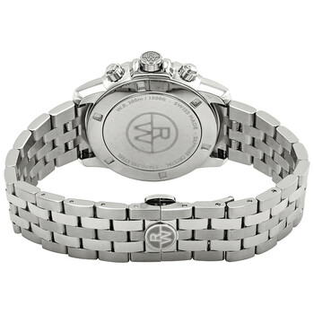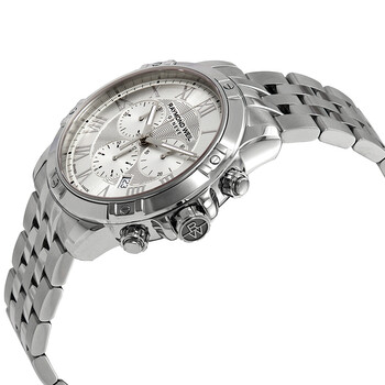 Stainless steel case with a stainless steel bracelet. Fixed stainless steel bezel. Silver dial with luminous silver-tone hands and Roman numeral hour markers. Minute markers around the outer rim. Dial Type: Analog. Luminescent hands. Date display between the 4 and 5 o'clock positions. Chronograph - three sub-dials displaying: 60 second, 30 minute and 12 hours. Quartz movement. Scratch resistant sapphire crystal. Screw down crown. Solid case back. Round case shape. Case size: 43 mm. Case thickness: 11.9 mm. Fold over clasp with a push button release. Water resistant at 300 meters / 1000 feet. Functions: chronograph, date, hour, minute, second. Dress watch style. Watch label: Swiss Made. Raymond Weil Tango Chronograph Silver Dial Men's Watch 8560-ST-00658.