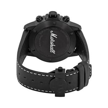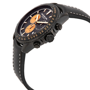 Black PVD stainless steel case with a black (calfskin) leather strap. Fixed black PVD stainless steel bezel. Black dial with luminous rose gold-tone hands and index hour markers. Minute markers around the outer rim. Dial Type: Analog. Luminescent hands and markers. Date display between the 4 and 5 o'clock positions. Quartz movement. Scratch resistant sapphire crystal. Screw down crown. Solid case back. Round case shape. Case size: 43 mm. Case thickness: 11.9 mm. Band width: 22 mm. Push button clasp. Water resistant at 300 meters / 1000 feet. Functions: chronograph, date, hour, minute, second. Additional Info: limited edition of 1000 pieces. Dive watch style. Watch label: Swiss Made. Raymond Weil Tango Marshall Amplification Chronograph Quartz Black Dial Men's Watch 8570-BKC-MARS1.