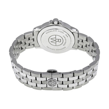 Stainless steel case with a stainless steel bracelet. Fixed stainless steel bezel. White dial with luminous silver-tone hands and Roman numeral hour markers. Minute markers around the outer rim. Luminescent hands and dial markers. Date displays at the 3 o'clock position. Quartz movement. Scratch resistant sapphire crystal. Solid case back. Case diameter: 39mm. Case thickness: 7.5 mm. Secured folding clasp. Water resistant at 50 meters / 165 feet. Functions: hours, minutes, seconds, calendar. Raymond Weil Tango Men's Watch 5599-ST-00308.
