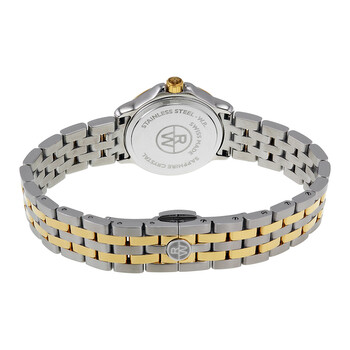 Stainless steel case with a two-tone (silver and yellow gold PVD) stainless steel bracelet. Fixed yellow gold PVD bezel. Mother of pearl dial with gold-toned hands and diamond hour markers. Roman numerals mark the 3, 6, 9 and 12 o'clock positions. Minute markers around an inner ring. Dial Type: Analog. Date display at the 3 o'clock position. Quartz movement. Scratch resistant sapphire crystal. Pull / push crown. Solid case back. Case diameter: 28 mm. Case thickness: 6.6 mm. Round case shape. Band width: 17.8 mm. Band length: 7 inches. Deployment clasp. Water resistant at 50 meters / 165 feet. Functions: date, hour, minute, second. Luxury watch style. Watch label: Swiss Made. Raymond Weil Tango Mother of Pearl Dial Ladies Watch 5391-STP-00995.