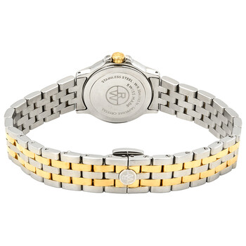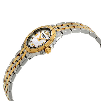 18kt yellow-gold plated and stainless steel case with a two-tone stainless steel bracelet. Fixed and designed bezel. Mother of pearl dial with gold-tone hands and Roman numeral and 8 diamond hour markers. Dial Type: Analog. Quartz movement. Scratch resistant anti-reflective Sapphire crystal. Case diameter: 23 mm. Case thickness: 5 mm. Round case shape. Band width: 11 mm. Deployment clasp. Water resistant at 50 meters / 165 feet. Functions: hour and minute. Dress watch style. Watch label: Swiss Made. Raymond Weil Tango Mother Of Pearl Dial Two-Tone Steel Ladies Watch 5799-STP-00995.