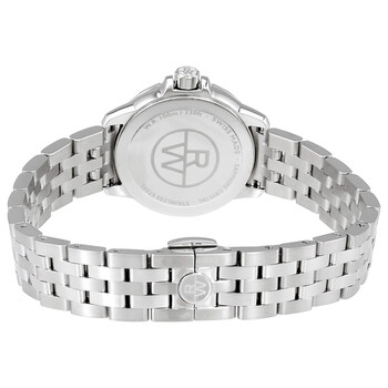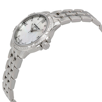 Stainless steel case with a stainless steel bracelet. Fixed stainless steel bezel set with diamonds. Mother of pearl dial with luminous silver-tone hands and diamond hour markers. Roman numerals mark the 6, 9 and 12 o'clock positions. Minute markers around the outer rim. Dial Type: Analog. Luminescent hands and markers. Date display at the 3 o'clock position. Quartz movement. Scratch resistant sapphire crystal. Screw down crown. Solid case back. Case size: 30 mm. Case thickness: 7.35 mm. Round case shape. Band width: 18 mm. Fold over clasp with a push button release. Water resistant at 100 meters / 330 feet. Functions: date, hour, minute, second. Additional Info: set with 44 diamonds (0.19 ct). Dress watch style. Watch label: Swiss Made. Raymond Weil Tango Mother of Pearl Diamond Dial Ladies Watch 5960-STS-00995.