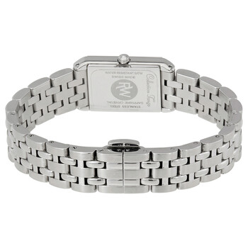 Stainless steel case with a stainless steel link bracelet. Fixed bezel. Mother of pearl dial with luminous hands and 8 diamond hour markers. Roman numerals mark the 3, 6, 9, and 12 o'clock position. Quartz movement. Scratch resistant sapphire crystal. Case diameter: 23 mm x 18.5 mm. Deployment clasp. Water resistant at 50 meters/ 165 feet. Functions: hours, minutes. Raymond Weil Tango Mother of Pearl Diamond Dial Ladies Watch 5971-ST-00995.