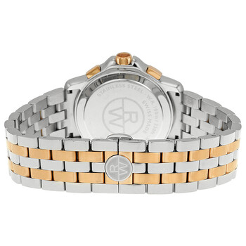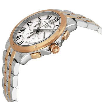 Stainless steel case with a two-tone (silver-tone and rose gold PVD) stainless steel bracelet. Fixed rose gold PVD bezel. Off white dial with luminous silver-tone hands and Roman numeral hour markers. Minute markers around an inner ring. Dial Type: Analog. Luminescent hands and markers. Date display at the 12 o'clock position. Chronograph - three sub-dials displaying: 60 second, 30 minute and 1/10th of a second. Quartz movement. Scratch resistant sapphire crystal. Pull / push crown. Solid case back. Case diameter: 40 mm. Case thickness: 11 mm. Round case shape. Band width: 19 mm. Band length: 8.75 inches. Deployment clasp. Water resistant at 100 meters / 330 feet. Functions: chronograph, date, hour, minute, second. Luxury watch style. Watch label: Swiss Made. Raymond Weil Tango Off White Dial Two Tone Men's Watch 4891-SP5-00660.