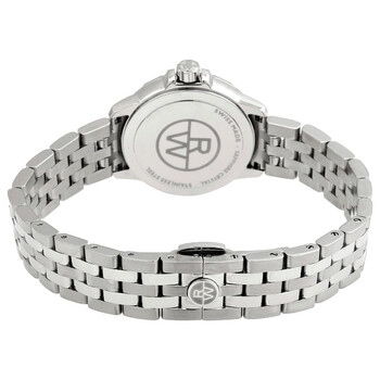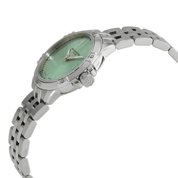 Stainless steel case with a stainless steel bracelet. Fixed stainless steel bezel. Green dial with luminous silver-tone hands and Roman numeral hour markers. Minute markers around the outer rim. Dial Type: Analog. Luminescent hands. Date display at the 3 o'clock position. Quartz movement. Scratch resistant sapphire crystal. Screw down crown. Solid case back. Round case shape. Case size: 30 mm. Case thickness: 7.35 mm. Fold over clasp with a safety release. Water resistant at 100 meters / 330 feet. Functions: date, hour, minute, second. Tango Series. Dress watch style. Watch label: Swiss Made. Raymond Weil Tango Quartz Green Dial Ladies Watch 5960 -ST -00520.