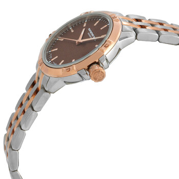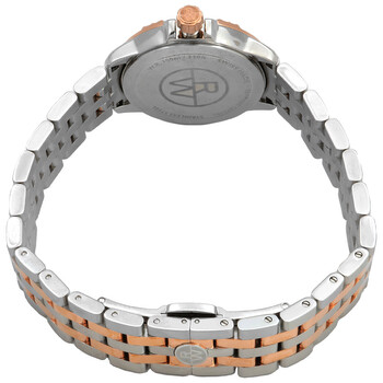 Silver-tone stainless steel case with a two-tone (silver-tone and rose gold-tone) stainless steel bracelet. Fixed rose gold-tone stainless steel bezel. Terra cotta frosted dial with rose gold-tone hands and index hour markers. Minute markers around the outer rim. Dial Type: Analog. Luminescent hands and markers. Date display at the 3 o'clock position. Quartz movement. Scratch resistant sapphire crystal. Screw down crown. Solid case back. Round case shape, case size: 30 mm, case thickness: 7.35 mm. Fold over clasp with a safety release. Water resistant at 100 meters / 330 feet. Functions: date, hour, minute, second. Tango Series. Casual watch style. Watch label: Swiss Made. Raymond Weil Tango Quartz Ladies Watch 5960-SP5-70061.