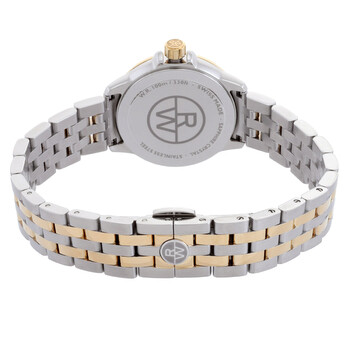 Silver-tone stainless steel case with a two-tone (silver-tone and gold-tone) stainless steel bracelet. Fixed gold-tone stainless steel bezel. Blue frosted dial with gold-tone hands and index hour markers. Minute markers around the outer rim. Dial Type: Analog. Luminescent hands and markers. Date display at the 3 o'clock position. Quartz movement. Scratch resistant sapphire crystal. Screw down crown. Solid case back. Round case shape, case size: 30 mm, case thickness: 7.35 mm. Fold over clasp with a safety release. Water resistant at 100 meters / 330 feet. Functions: date, hour, minute, second. Tango Series. Casual watch style. Watch label: Swiss Made. Raymond Weil Tango Quartz Ladies Watch 5960-STP-50061.