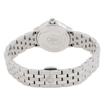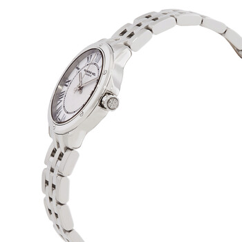 Silver-tone stainless steel case and bracelet. Fixed silver-tone stainless steel bezel. White dial with silver-tone hands and Roman numeral hour markers. Minute markers around the inner ring. Dial Type: Analog. Date display at the 3 o'clock position. Quartz movement. Scratch resistant sapphire crystal. Pull / push crown. Solid case back. Round case shape, case size: 28 mm, case thickness: 6.6 mm. Band width: 17.8 mm. Deployment clasp. Water resistant at 30 meters / 100 feet. Functions: date, hour, minute, second. Tango Series. Casual watch style. Watch label: Swiss Made. Raymond Weil Tango Quartz White Dial Ladies Watch 5391-ST-00308.