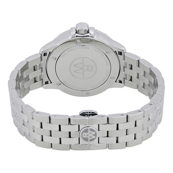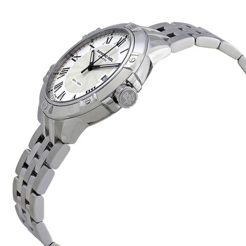 Stainless steel case with a stainless steel bracelet. Fixed stainless steel bezel. White dial with luminous black hands and Roman numeral hour markers. Minute markers around the outer rim. Dial Type: Analog. Luminescent hands. Date display at the 3 o'clock position. Quartz movement. Scratch resistant sapphire crystal. Screw down crown. Solid case back. Round case shape. Case size: 41 mm. Case thickness: 7.4 mm. Band width: 19.75 mm. Fold over clasp with a push button release. Water resistant at 300 meters / 1000 feet. Functions: date, hour, minute, second. Dress watch style. Watch label: Swiss Made. Raymond Weil Tango Quartz White Dial Men's Watch 8160-ST-00300.