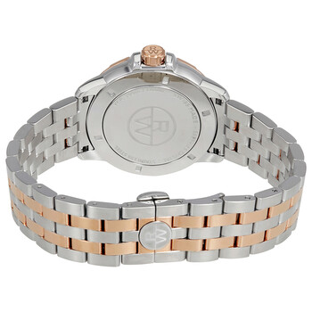 Stainless steel case with a two-tone (silver and rose gold-plated) stainless steel bracelet. Fixed rose gold-plated bezel. Silver dial with rose gold-tone hands and Roman numeral hour markers. Minute markers around the outer rim. Dial Type: Analog. Date display at the 3 o'clock position. Quartz movement. Scratch resistant sapphire crystal. Screw down crown. Solid case back. Case size: 41 mm. Case thickness: 7.4 mm. Round case shape. Fold over clasp with a push button release. Water resistant at 300 meters / 1000 feet. Functions: date, hour, minute, second. Dress watch style. Watch label: Swiss Made. Raymond Weil Tango Silver Dial Men's Watch 8160-SP5-00658.