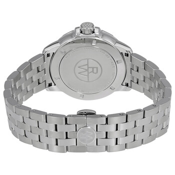 Stainless steel case with a stainless steel bracelet. Fixed stainless steel bezel. Silver dial with luminous silver-tone hands and Roman numeral hour markers. Minute markers around the outer rim. Dial Type: Analog. Luminescent hands. Date display at the 3 o'clock position. Quartz movement. Scratch resistant sapphire crystal. Screw down crown. Solid case back. Case size: 41 mm. Case thickness: 7.4 mm. Round case shape. Band width: 20 mm. Fold over clasp with a push button release. Water resistant at 300 meters / 1000 feet. Functions: date, hour, minute, second. Dress watch style. Watch label: Swiss Made. Raymond Weil Tango Silver Dial Men's Watch 8160-ST-00658.