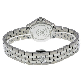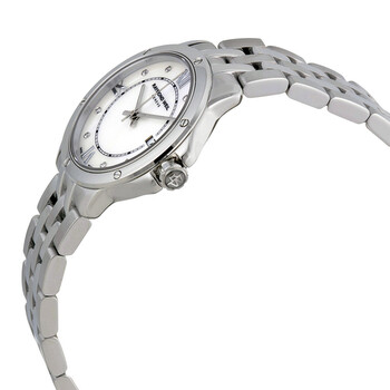 Stainless steel case with a stainless steel bracelet. Fixed stainless steel bezel. Mother of pearl dial with silver-tone hands and diamond hour markers. Roman numerals mark the 3, 6, 9 and 12 o'clock positions. Minute marlers around an inner ring. Dial Type: Analog. Luminescent hands. Date display at the 3 o'clock position. Quartz movement. Scratch resistant sapphire crystal. Pull / push crown. Solid case back. Case diameter: 28 mm. Case thickness: 7 mm. Round case shape. Band width: 16 mm. Hidden folding clasp. Water resistant at 50 meters / 165 feet. Functions: date, hour, minute, second. Casual watch style. Watch label: Swiss Made. Raymond Weil Tango Silver Dial Stainless Steel Ladies Watch 5391-ST-00995.