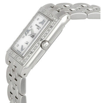 Stainless steel case with a stainless steel link bracelet. Fixed stainless steel bezel set with 43 diamonds (0.31 carat). White mother of pearl dial with silver-tone hands and diamond hour markers, Roman numerals mark the 3, 6, 9 and 12 o'clock positions. Minute markers around the outer rim. Luminescent hands and dial markers. Date display at the 4 o'clock position. Swiss quartz movement. Scratch resistant sapphire crystal. Solid case back. Case diameter: 18.5 mm. Case thickness: 6.5 mm. Deployment clasp. Water resistant at 50 meters / 165 feet. Functions: hours, minutes, date. Raymond Weil Tango Spirit Ladies Watch 5981-STS-97650.
