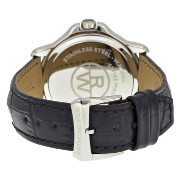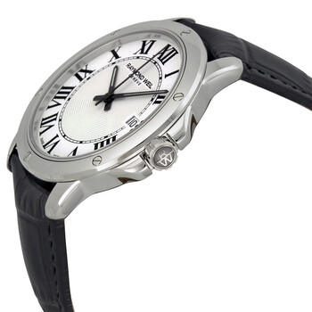 Stainless steel case with a black leather strap. Fixed stainless steel bezel. White dial with luminous silver-tone hands and Roman numeral hour markers. Minute markers around an inner ring. Dial Type: Analog. Luminescent hands and markers. Date display at the 3 o'clock position. Quartz movement. Scratch resistant sapphire crystal. Pull / push crown. Solid case back. Case diameter: 39 mm. Case thickness: 8 mm. Round case shape. Band width: 20 mm. Band length: 8.5 inches. Tang clasp. Water resistant at 100 meters / 330 feet. Functions: date, hour, minute, second. Casual watch style. Watch label: Swiss Made. Raymond Weil Tango White Black Leather Men's Watch 5591-L1-00300.