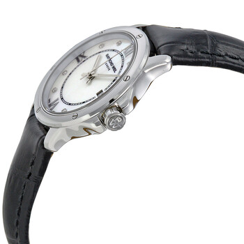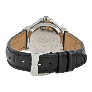 Stainless steel case with a black (croco-embossed) leather strap. Fixed stainless steel bezel. White dial with luminous silver-tone hands and diamond hour markers. Roman numerals mark the 3, 6, 9 and 12 o'clock positions. Minute markers around an inner ring. Dial Type: Analog. Luminescent hands and markers. Date display at the 3 o'clock position. Quartz movement. Scratch resistant sapphire crystal. Pull / push crown. Solid case back. Case diameter: 28 mm. Case thickness: 7 mm. Round case shape. Band width: 13 mm. Band length: 7.75 inches. Tang clasp. Water resistant at 100 meters / 330 feet. Functions: date, hour, minute, second. Casual watch style. Raymond Weil Tango White Dial Black Leather Ladies Watch 5391-L1-00995.