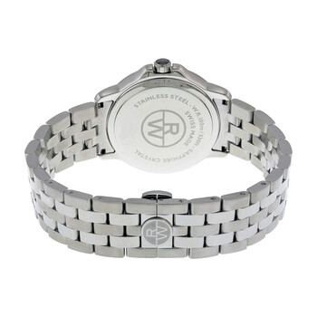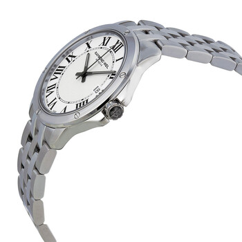 Stainless steel case with a stainless steel bracelet. Fixed stainless steel bezel. White dial with luminous black hands and Roman numeral hour markers. Minute markers around an inner ring. Dial Type: Analog. Luminescent hands. Date display at the 3 o'clock position. Quartz movement. Scratch resistant sapphire crystal. Pull / push crown. Solid case back. Case diameter: 39 mm. Case thickness: 7.9 mm. Round case shape. Band width: 20.3 mm. Band length: 8 inches. Deployment clasp. Water resistant at 100 meters / 330 feet. Functions: date, hour, minute, second. Luxury watch style. Watch label: Swiss Made. Raymond Weil Tango White Dial Stainless Steel Men's Watch 5591-ST-00300.