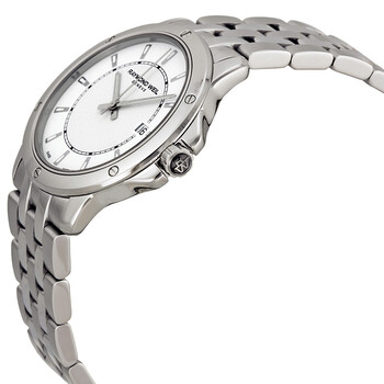 Stainless steel case with a stainless steel bracelet. Fixed stainless steel bezel. White dial with silver-tone hands and stick hour markers. Minute markers around an inner circle. Dial Type: Analog. Luminescent hands and markers. Date display at the 3 o'clock position. Quartz movement. Scratch resistant sapphire crystal. Pull / push crown. Solid case back. Case diameter: 39 mm. Case thickness: 7.9 mm. Round case shape. Deployment clasp with push button. Water resistant at 100 meters / 330 feet. Functions: date, hour, minute, second. Dress watch style. Watch label: Swiss Made. Raymond Weil Tango White Dial Stainless Steel Men's Watch 5591-ST-30001.
