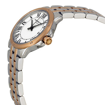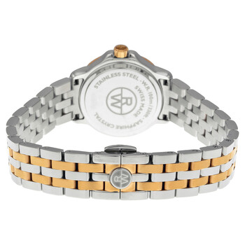 Stainless steel case with a two-tone (silver and rose gold PVD) stainless steel bracelet. Fixed rose gold PVD bezel. White dial with luminous hands and Roman numeral hour markers. Minute markers around an inner ring. Dial Type: Analog. Date display at the 3 o'clock position. Quartz movement. Scratch resistant sapphire crystal. Solid case back. Case diameter: 28 mm. Case thickness: 6.6 mm. Round case shape. Band width: 17 mm. Band length: 8 inches. Deployment clasp. Water resistant at 100 meters / 330 feet. Functions: date, hour, minute, second. Dress watch style. Watch label: Swiss Made. Raymond Weil Tango White Dial Steel and Rose Gold PVD Ladies Watch 5391-SP5-00300.