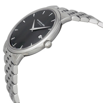 Stainless steel case with a stainless steel bracelet. Fixed stainless steel bezel. Black dial with silver-tone hands and index hour markers. Minute markers around the outer rim. Dial Type: Analog. Date display at the 3 o'clock position. Quartz movement. Scratch resistant sapphire crystal. Push / pull crown. Solid case back. Case diameter: 42 mm. Case thickness: 7.82 mm. Round case shape. Bracelet width: 20 mm. Deployment clasp. Water resistant at 50 meters / 165 feet. Functions: date, hour, minute. Dress watch style. Watch label: Swiss Made. Item Variations: 5588 ST 20001, 5588.ST.20001, 5588ST20001. Raymond Weil Toccata Black Dial Men's 42 mm Watch 5588-ST-20001.