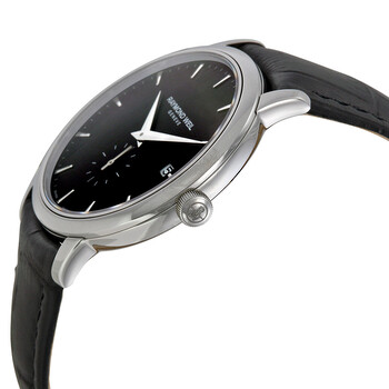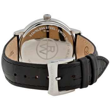 Stainless steel case with a black (Calfskin) leather strap. Fixed stainless steel bezel. Black dial with silver-tone hands and index hour markers. Minute markers around the outer rim. Dial Type: Analog. Date display at the 3 o'clock position. Seconds sub-dial above the 6 o'clock position. Quartz movement. Scratch resistant sapphire crystal. Pull / push crown. Solid case back. Case diameter: 39 mm. Case thickness: 8 mm. Round case shape. Band width: 19 mm. Band length: 7.75 inches. Tang clasp. Water resistant at 50 meters / 165 feet. Functions: date, hour, minute, second. Casual watch style. Raymond Weil Toccata Black Dial Black Leather Men's Watch RW-5484-STC-20001.