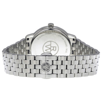 Stainless steel case with a stainless steel bracelet. Fixed stainless steel bezel. Blue dial with silver-tone hands and index hour markers. Minute markers around the outer rim. Dial Type: Analog. Date display at the 3 o'clock position. Quartz movement. Scratch resistant sapphire crystal. Pull / push crown. Solid case back. Case size: 39 mm. Case thickness: 8 mm. Round case shape. Band width: 20 mm. Band length: 8.5 inches. Deployment clasp. Water resistant at 50 meters / 165 feet. Functions: date, hour, minute, second. Casual watch style. Watch label: Swiss Made. Item Variations: RW 5488 ST 50001, RW.5488.ST.50001, RW5488ST50001. Raymond Weil Toccata Blue Dial Men's Watch 5488-ST-50001.