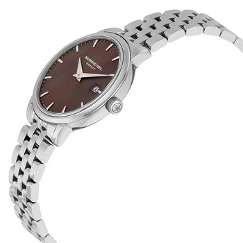 Stainless steel case with a stainless steel bracelet. Fixed stainless steel bezel. Brown dial with silver-toned hands and index hour markers. Minute markers around the outer rim. Dial Type: Analog. Date display at the 3 o'clock position. Quartz movement. Scratch resistant sapphire crystal. Pull / push crown. Solid case back. Case diameter: 29 mm. Case thickness: 6.79 mm. Round case shape. Fold over clasp with a double push button release. Water resistant at 50 meters / 165 feet. Functions: date, hour, minute, second. Luxury watch style. Watch label: Swiss Made. Item Variations: 5988 ST 70001, 5988.ST.70001, 5988ST70001. Raymond Weil Toccata Brown Dial Stainless Steel Ladies Watch 5988-ST-70001.