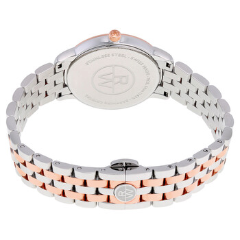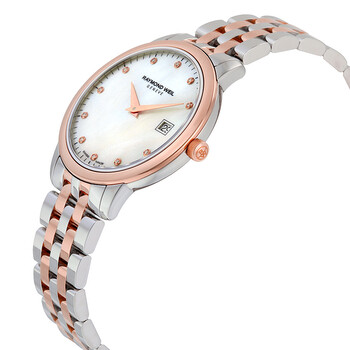Stainless steel case with a two-tone (silver and rose gold PVD) stainless steel bracelet. Fixed rose gold PVD bezel. Mother of pearl dial with rose gold-tone hands and diamond hour markers. Minute markers around the outer rim. Dial Type: Analog. Date display at the 3 o'clock position. Quartz movement. Scratch resistant sapphire crystal. Solid case back. Case diameter: 34 mm. Case thickness: 7 mm. Round case shape. Fold over clasp with double push button release. Water resistant at 50 meters / 165 feet. Functions: date, hour, minute, second. Luxury watch style. Item Variations: 5388 SP5 97081, 5388.SP5.97081, 5388SP597081. Raymond Weil Toccata Mother of Pearl Diamond Dial Two-tone Ladies Watch 5388-SP5-97081.