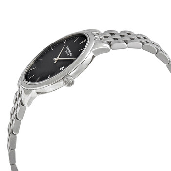 Stainless steel case with a stainless steel bracelet. Fixed stainless steel bezel. Black dial with silver-tone hands and index hour markers. Minute markers around the outer rim. Dial Type: Analog. Date display at the 3 o'clock position. Quartz movement. Scratch resistant sapphire crystal. Pull / push crown. Solid case back. Round case shape. Case size: 39 mm. Case thickness: 7.82 mm. Band width: 20 mm. Fold over clasp with a double push-security system. Water resistant at 50 meters / 165 feet. Functions: date, hour, minute, second. Dress watch style. Watch label: Swiss Made. Raymond Weil Toccata Quartz Black Dial Men's Watch 5485-ST-20001.