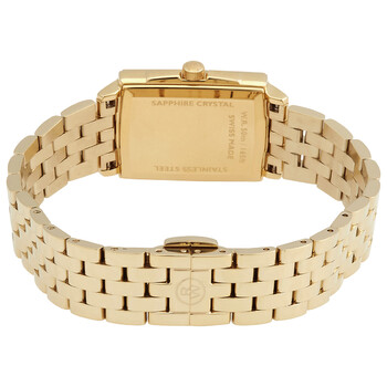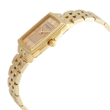 Yellow gold PVD stainless steel case and bracelet. Fixed yellow gold PVD stainless steel bezel. Champagne dial with yellow gold-tone hands and Roman numeral hour markers. Minute markers around the inner ring. Dial Type: Analog. Date display at the 3 o'clock position. Quartz movement. Scratch resistant sapphire crystal. Pull / push crown. Solid case back. Rectangle case shape, case size: 22.6 mm x 28.1 mm, case thickness: 6.4 mm. Stainless steel folding with double push-sec clasp. Water resistant at 50 meters / 165 feet. Functions: date, hour, minute. Toccata Series. Dress watch style. Watch label: Swiss Made. Raymond Weil Toccata Quartz Champagne Dial Ladies Watch 5925-P-00100.