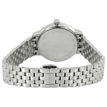 Stainless steel case with a stainless steel bracelet. Fixed stainless steel bezel. Blue dial with silver-tone hands and diamond hour markers. Minute markers around the outer rim. Dial Type: Analog. Date display at the 3 o'clock position. Quartz movement. Scratch resistant sapphire crystal. Pull / push crown. Solid case back. Round case shape. Case size: 29 mm. Fold over clasp. Water resistant at 50 meters / 165 feet. Functions: date, hour, minute, second. Toccata Series. Dress watch style. Watch label: Swiss Made. Raymond Weil Toccata Quartz Diamond Blue Dial Ladies Watch 5985-ST-50081.